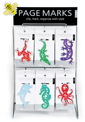 Page marks easily clip over your pages or papers to keep you on track. Each page mark is decorated with beautiful foil embellishments for a very sleek design. The line has 12 designs which are appealing to all ages. Bookmark backers are 2.75”w x 6”h. All designs come 6 per package. There are 2 silver display options, the 6 & 10 hook displays. Each hook holds up to 24 bookmarks. |